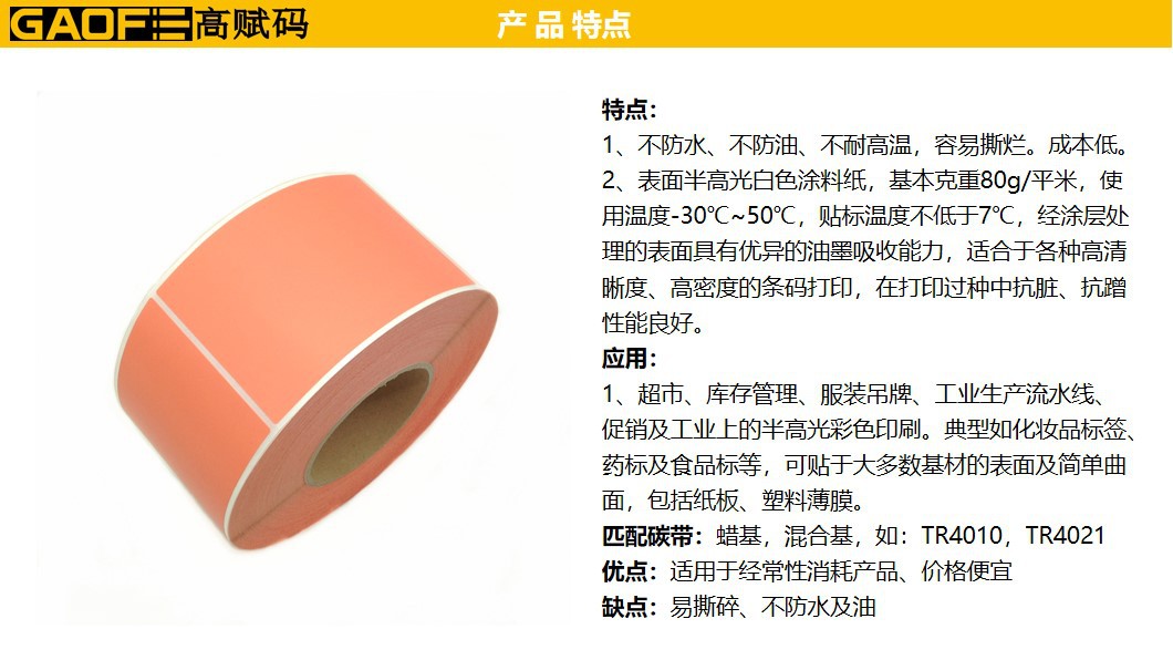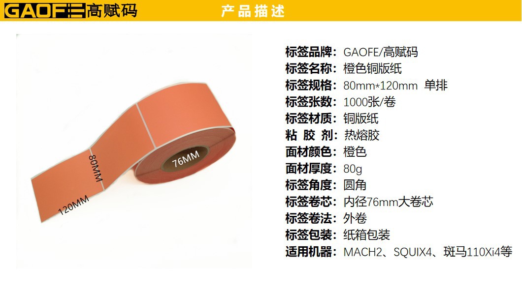 不干膠標(biāo)簽 銅版紙標(biāo)簽貼紙 橙色標(biāo)簽 80mm*120mm 1000張 高賦碼