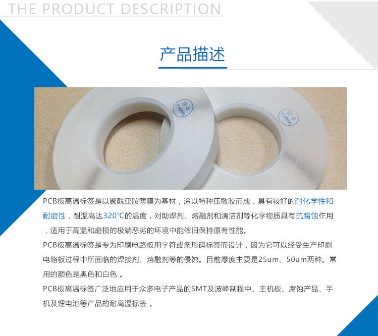 PCB板高溫標簽聚酰亞胺薄膜為基材,涂以特種壓敏膠而成,具有較好的耐化學性和耐磨性,耐溫范圍200℃~600℃,對助焊劑、熔融劑和清潔劑等化學物質具有抗腐蝕作用,使用于高溫和磨損的極端惡劣的環(huán)境中能保持原本性能。它是專為印刷電路板用字符或條形碼標簽而設計,因為它可以經(jīng)受生產(chǎn)印刷電路板過程中所面臨的焊接劑、熔融劑等的侵蝕。目前厚度主要是25um、50um兩種。常用的顏色是黑色和白色 。PCB板高溫標簽廣泛地應用于眾多電子產(chǎn)品的SMT及波峰制程中、主機板、腐蝕產(chǎn)品、手機及鋰電池等產(chǎn)品的PCB板高溫標簽。