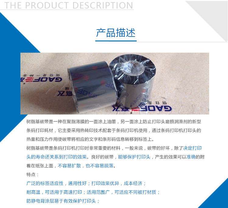 樹脂基碳帶品質(zhì)高、高速打印性能,優(yōu)異的耐磨擦、耐熱、耐腐蝕、耐久性能,耐磨能滿足各種苛刻環(huán)境要求,高敏感度,確保優(yōu)異的圖像打印效果,防靜電背涂層,有效保護打印頭。