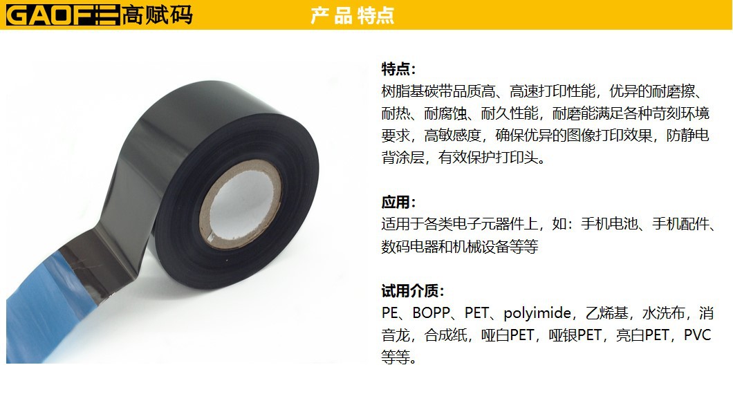樹脂基碳帶品質(zhì)高、高速打印性能,優(yōu)異的耐磨擦、耐熱、耐腐蝕、耐久性能,耐磨能滿足各種苛刻環(huán)境要求,高敏感度,確保優(yōu)異的圖像打印效果,防靜電背涂層,有效保護打印頭。