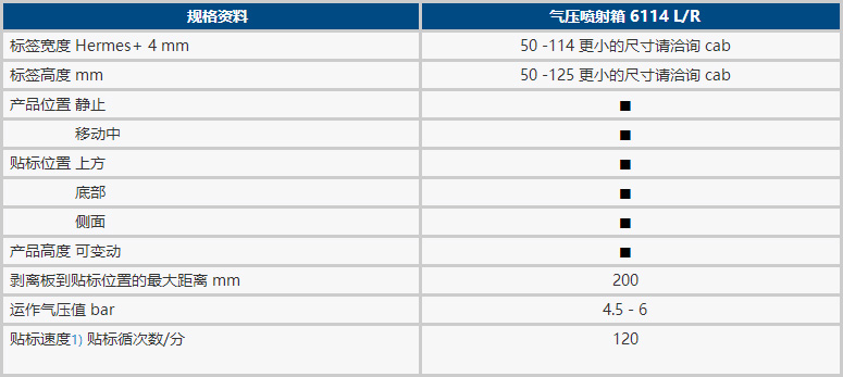 借由風(fēng)扇吸取標(biāo)簽并利用強(qiáng)力的噴射氣流經(jīng)由調(diào)整過的噴嘴吹貼標(biāo)簽。依據(jù)標(biāo)簽尺寸,自產(chǎn)品到剝離板的距離最大為 200 mm。