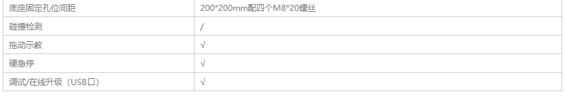 支持碰撞檢測(cè)、拖動(dòng)示教、硬急停、調(diào)試/在線升級(jí)(USB口)